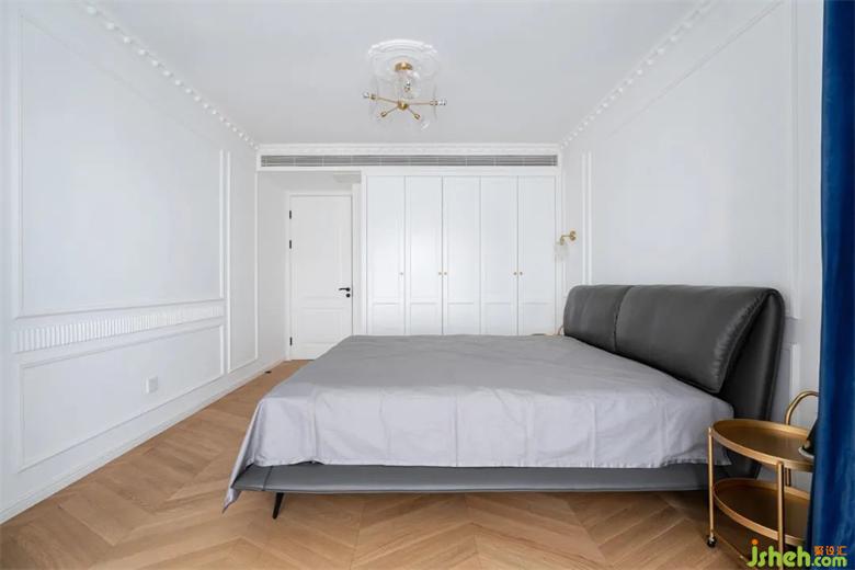 深灰色的皮质床头沉稳大气,一侧的衣柜保证了日常装修的储物需求。