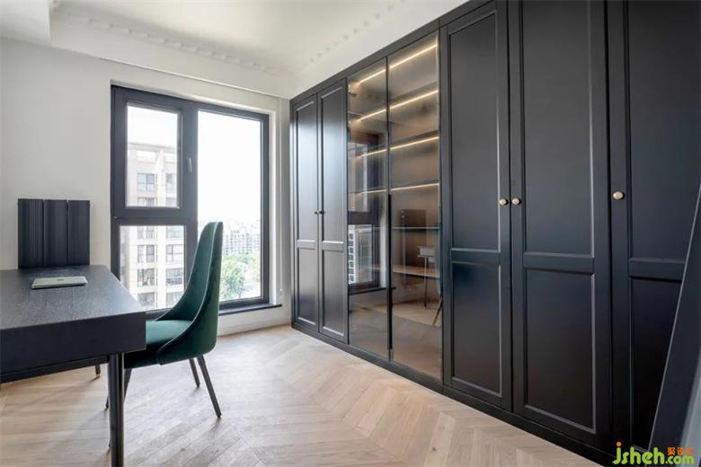 深颜色的储物柜与装修玻璃柜门结合,装修打破整面黑色带来的沉闷感,大尺寸的工作台满足日常的办公需求。