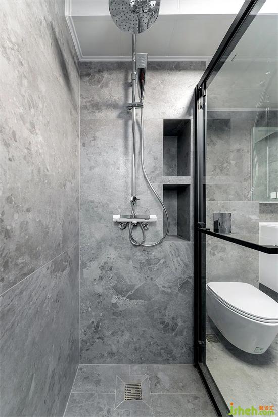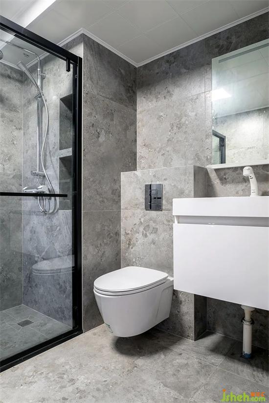 卫生间增加了淋浴房,选用了好清理卫生的壁挂马桶。装修通铺深灰色的磁砖,空间既整体又耐脏。