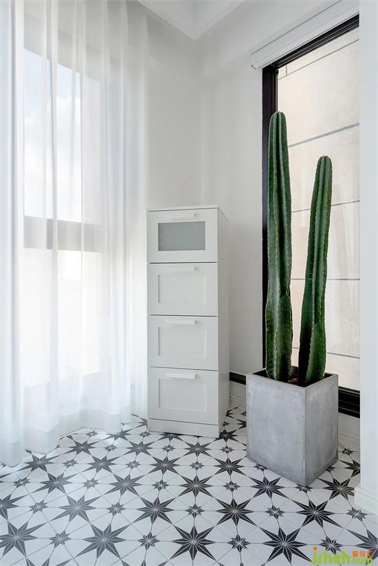 水泥盆质感的绿植生机勃勃,旁边窗户选用了不占空间的百叶帘。