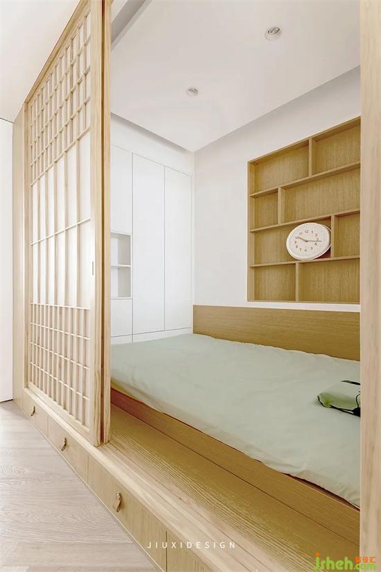主卧空间主要是采用地台和柜体相结合的形式来装修设计,这样既可以节省空间,又可以增加屋里的收纳。