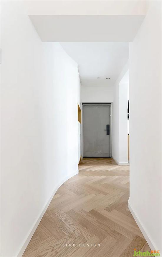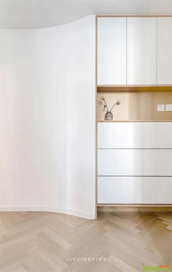 弧形墙体挡住了鞋柜的侧面,装修设计利用这个优点,完美的嵌入了一面超薄鞋柜,解决了原来入户没有鞋柜的窘境。