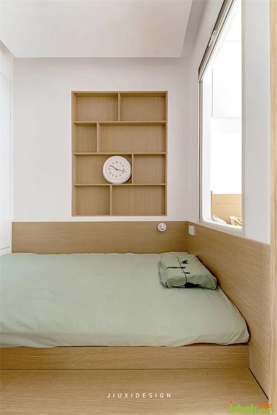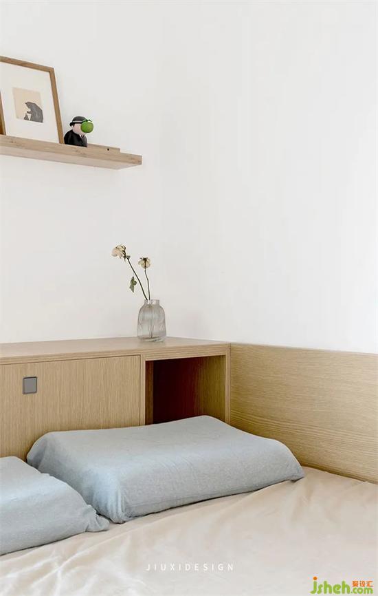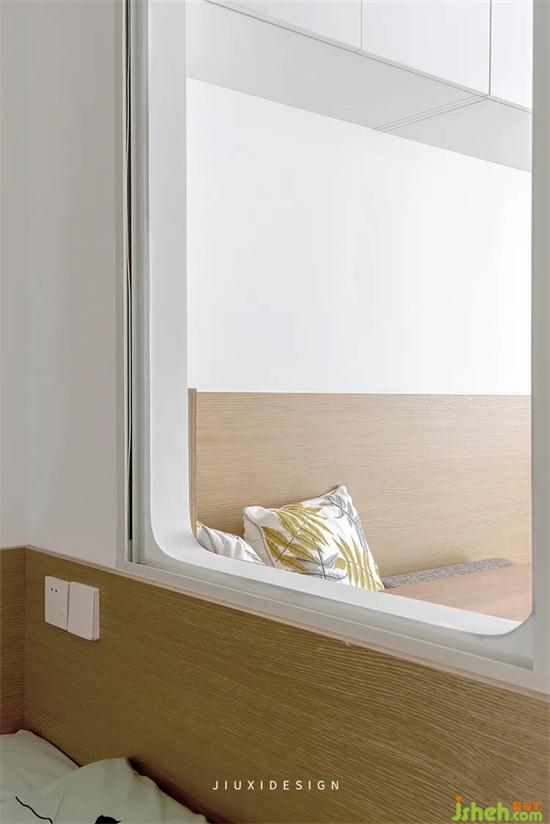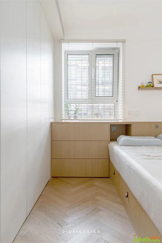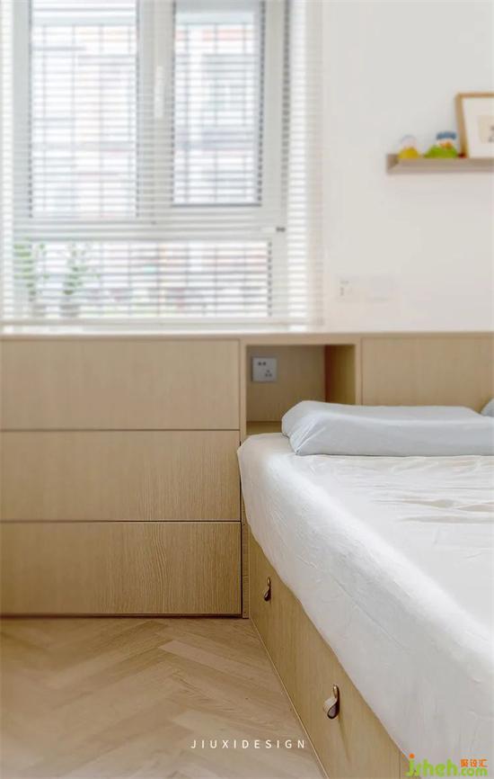 卧室的床头做成一组柜子,装修设计具备收纳,也加宽了窗台,有一种飘窗的感觉。