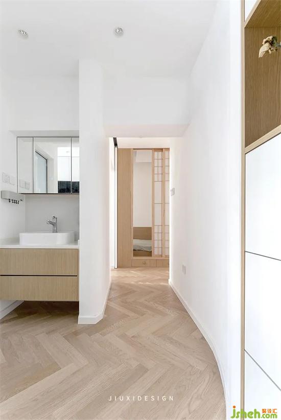 原卫生间很小很小,改造的方法,是把原来主卧的门洞,变更到了儿童房一侧,利用墙厚把水盆外移到这里。