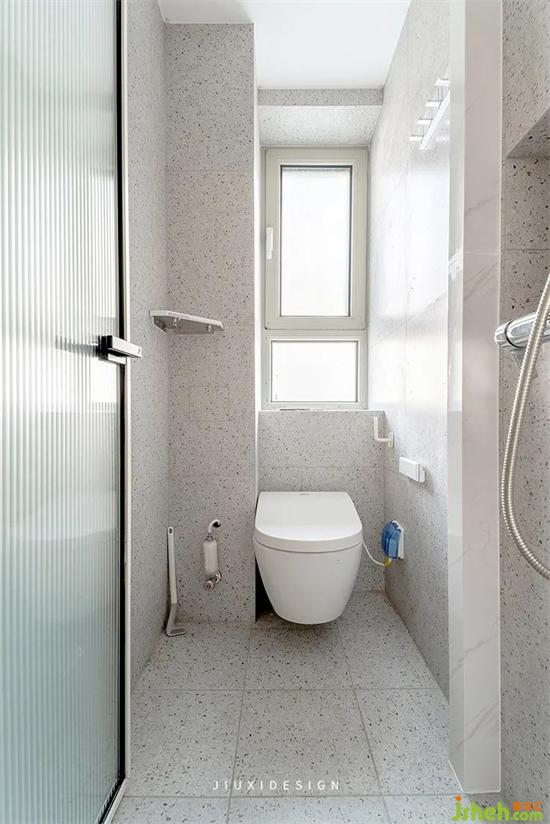 墙地砖都用水磨石通铺,效果还是不错的。这种空间其实最不建议用白色,深色或者灰色相反效果更好。