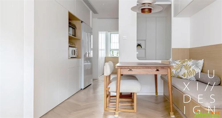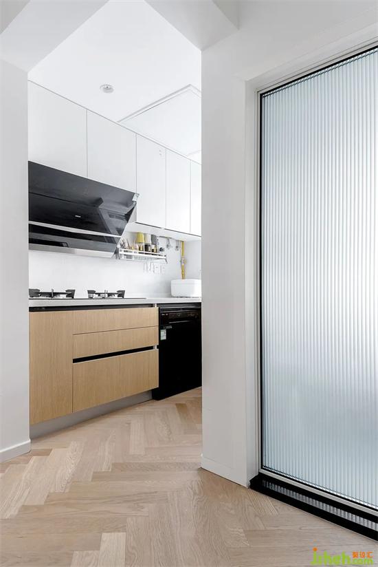厨房是做了开放式设计,人字拼地板直接通铺到这里,装修设计让空间有了不断的延伸感,也让入户后空间,不会显得那么局促。