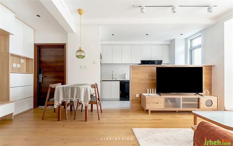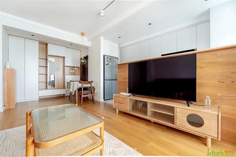 厨房与客厅之间的格局打开后,电视背景墙采用了木地板上墙的拼接方式,让墙面与地面形成一个整体。