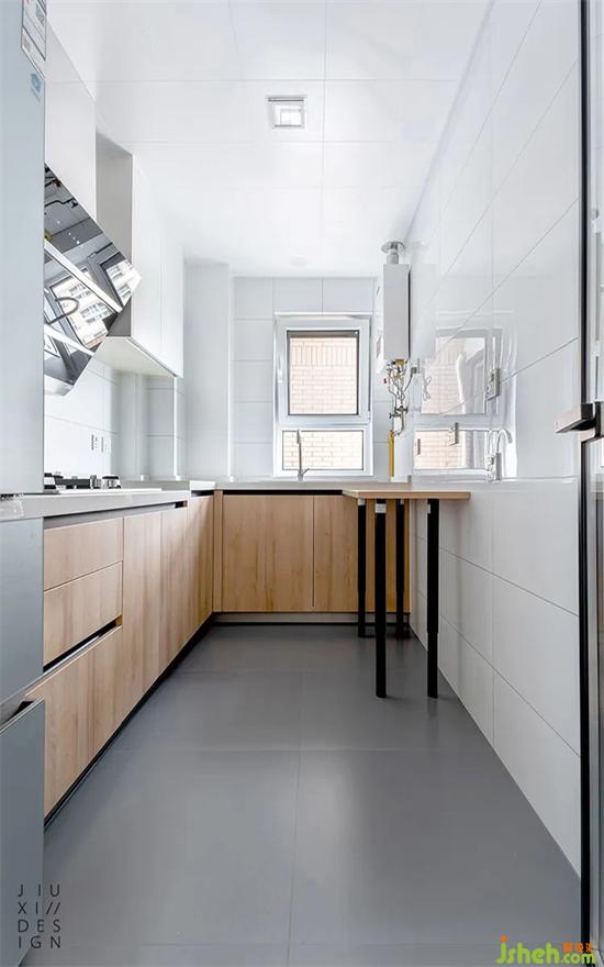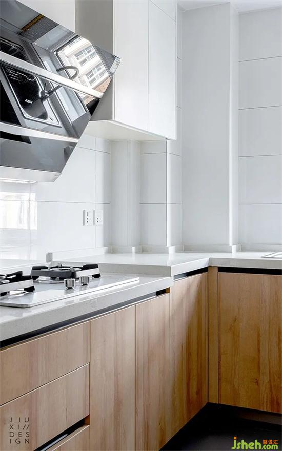 橱柜选用暗藏把手,避免使用当中受到磕碰。台面设计了高低台,让清洗和配菜区更高一些,这样不装修设计用弯腰太多。烧菜因为有锅的高度,所以台面低一些会比较顺手。