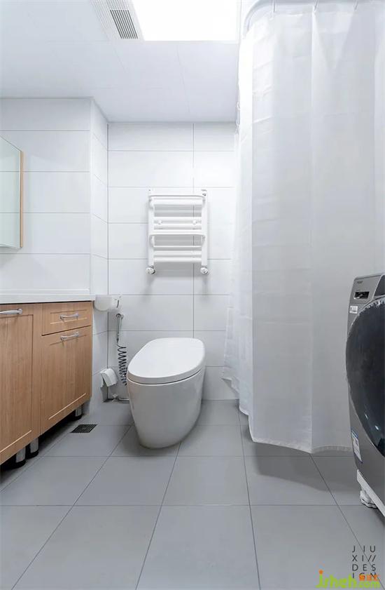 简单的灰白搭配,加上木色手盆柜,日式感依然存在。淋浴区没有做成封闭式装修设计,而且面积也小。考虑到提高老人使用的便捷性,浴帘会更方便出入,也不会显得局促。
