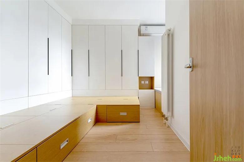 次卧是两位老人休息的房间,年纪大了身体不好,所以分成了两个单人位的榻榻米,方便平时的使用和照顾。收纳上也做到了极致,除了床就是柜子。