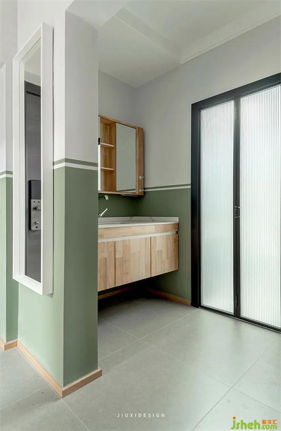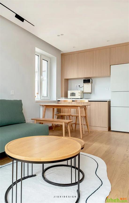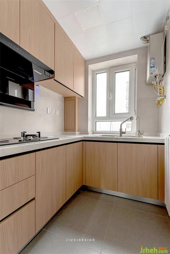 厨房整体以原木和灰色砖为主,干净整洁。室内设计师为了达到整体结室内设计师构统一,下水也用板式家具包覆隐藏,同时预留了可以开启的检修口,将细节感拉满。