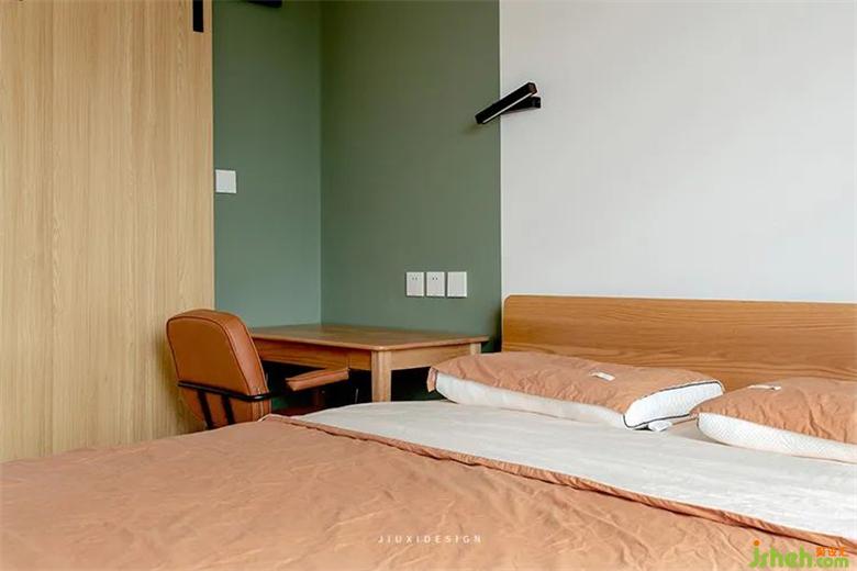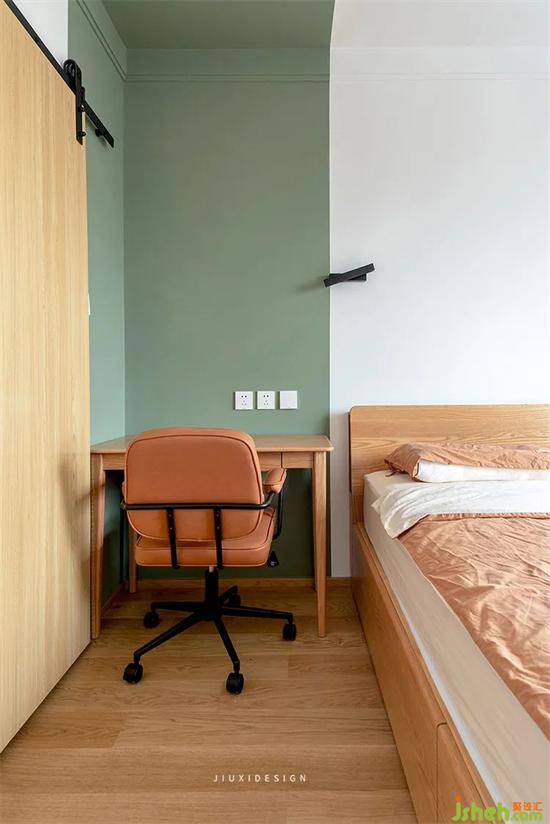 由于屋主有在家偶尔室内设计师办公的需求,在床头增加了办公区,床品和椅子的配色,统一空间色调,拥有变化还不失单调。