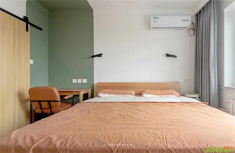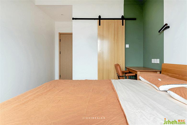 卧室利用色块划分了功能区,室内设计师增加空间趣味性。