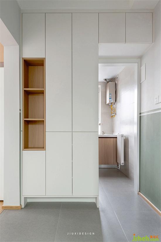 缩小厨房空间,新增加的玄关储物柜,满足日常的食用储备。原来在厨房暴露出来,纵横交错的一堆室内设计师管道,正好可以通过玄关柜将其全部隐藏。