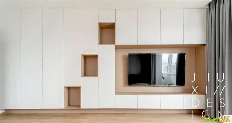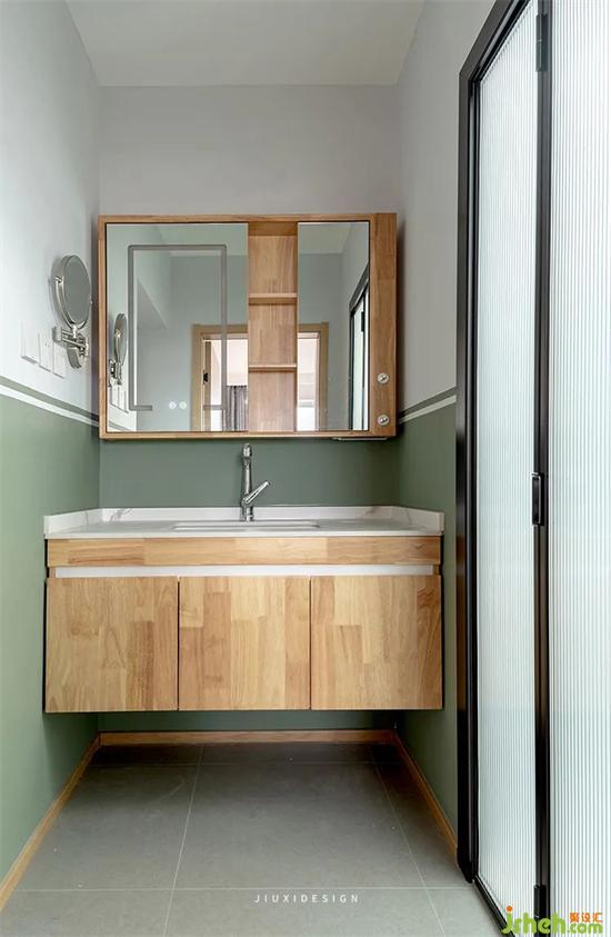 一路延展的线条,划分上下墙的撞色关系。隔壁的玄关增加全身镜,正好可以把后面的强电箱做隐藏。