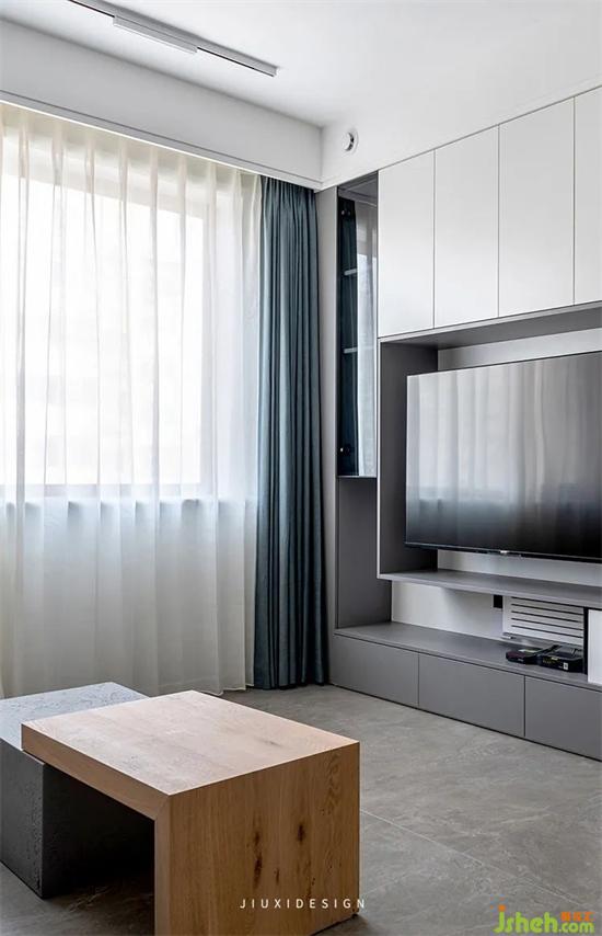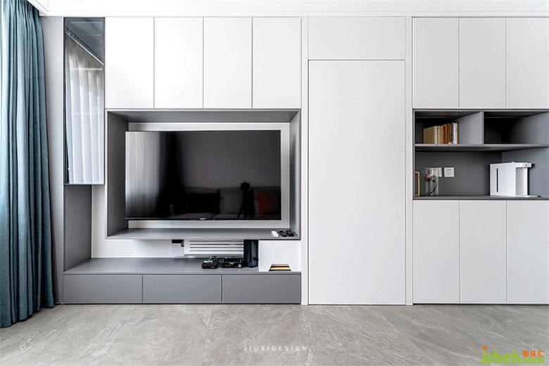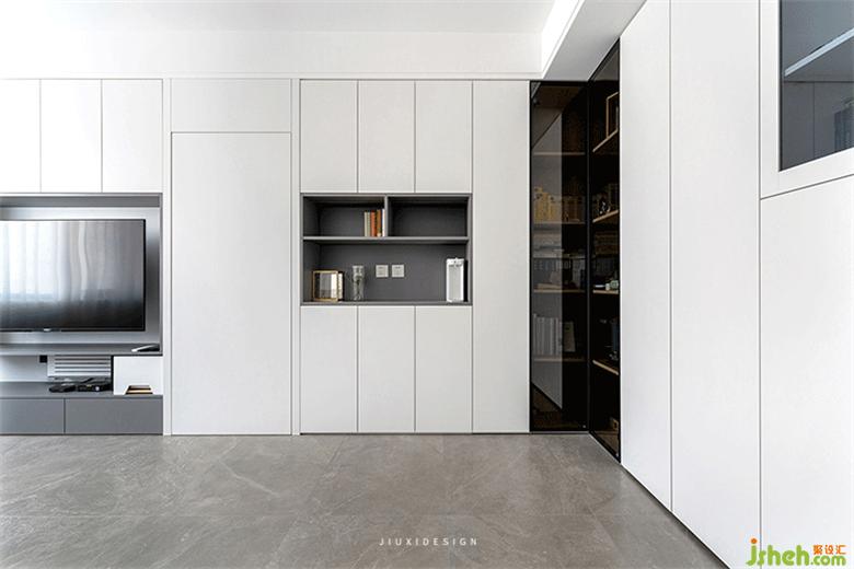 电视背景墙采用部分开放式展示柜,摆放主人公喜爱的艺术摆件,增添空间趣味性。室内设计通过隐形门的形式与餐厅区域合为一体,让简约质感体现得淋漓尽致,达到整体贯连一致,色系的统一感。