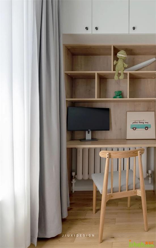 尽管孩子还小,但是他的独立学习空间,要提前归置好,从小培养他的独立能力和学习能力。书柜设置有藏有露,实用且不凌乱。