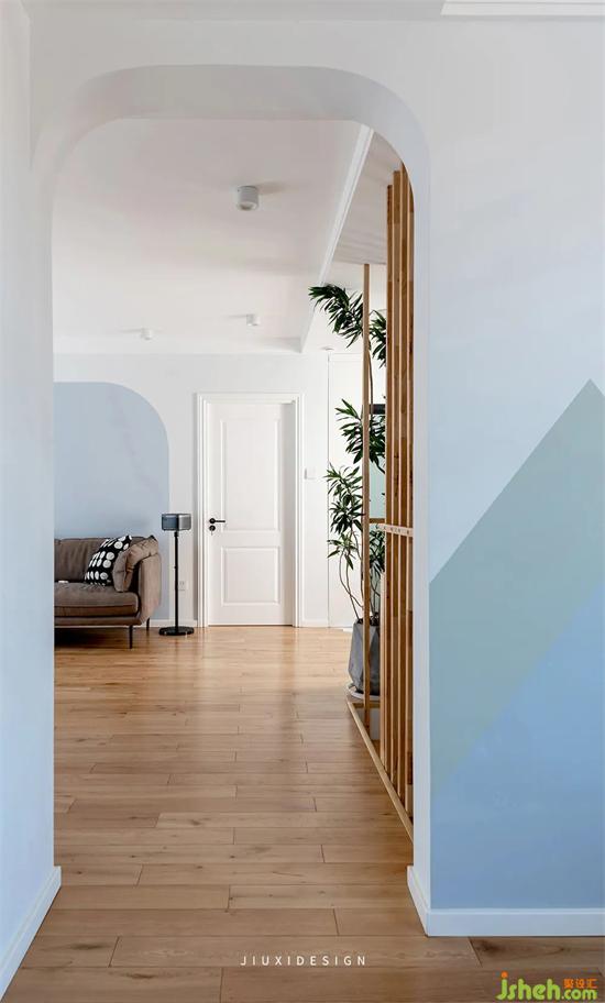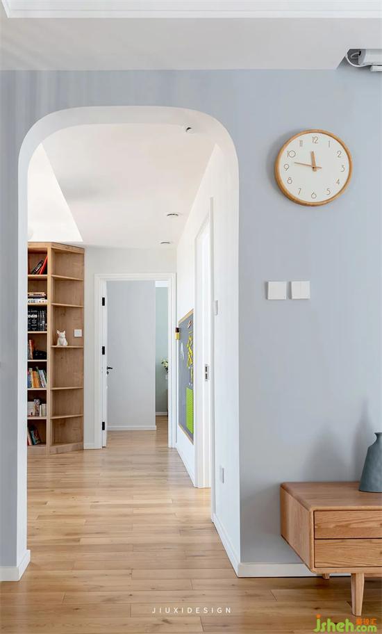 弧形的门洞将客厅与书房分隔开来,吊顶明显了区域划分,也为新风预留了位置。书柜像是从地板上生长出来一样,搭配大面积的清爽白色,层次分明更有质感。沙发室内装修背景墙的弧形造型,与书房的小山造型一柔一刚,色调相连,圆缓与笔直,体现了两个空间不同的动与静,曲与直。