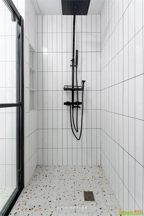 钻石型的黑色边框淋浴房,与白色的墙面形成对比,室内装修显得格外高级。浴室柜旁做了单独的收纳架,方便存放洗漱用品。