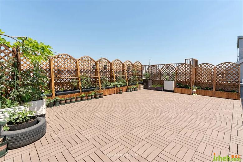 露台地面整体铺设了室外专用塑木地板,方便打理。露台外侧,用原木花架所包围,美观又安全。随处安放的绿植和蔬菜,有一种回归田园的味道,当然这也是户外烧烤的绝佳之地。
