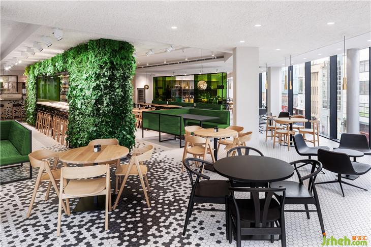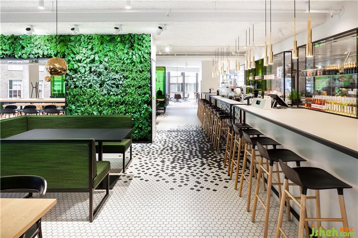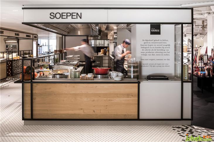 灵感来自于公司名称De Bijenkorf (beehive),它的六边形标志指的是一个蜂巢,i29设计了一个生动的黑色六边形瓷砖图案,接缝“聚集”在轻地板、酒吧和柜台前面。