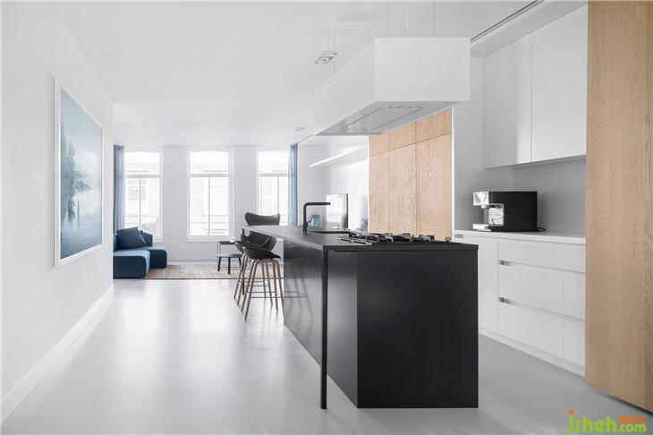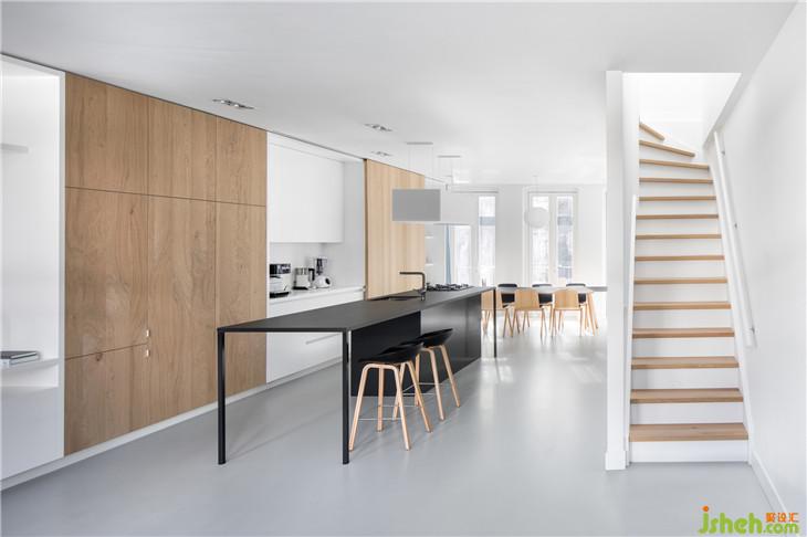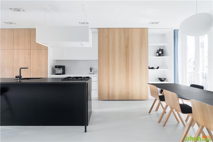 包括橱柜,电视柜和专门设计的厨房,都可以可以通过大型橡木墙完全隔离。 一个对比鲜明的黑色厨房被放置在这个空间的中心。