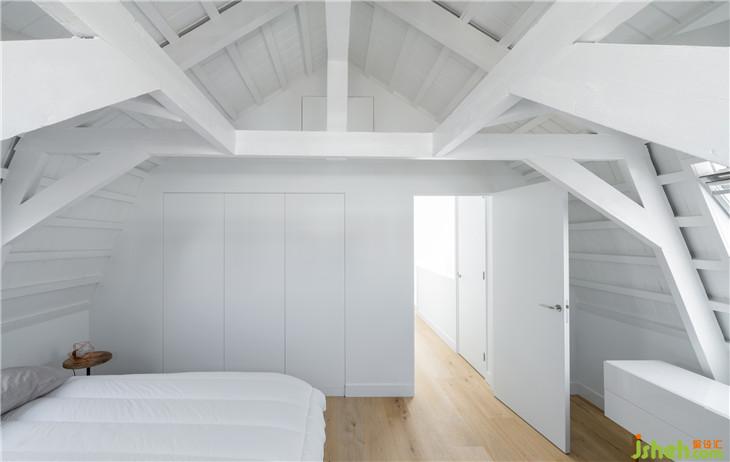 阁楼被改成新的布局,实现了两间卧室和一间浴室多样空间。 除了橡木地板外,屋顶结构完全采用白色装饰,浴室内置浴缸和LG HiMacs定制设计的洗脸盆。