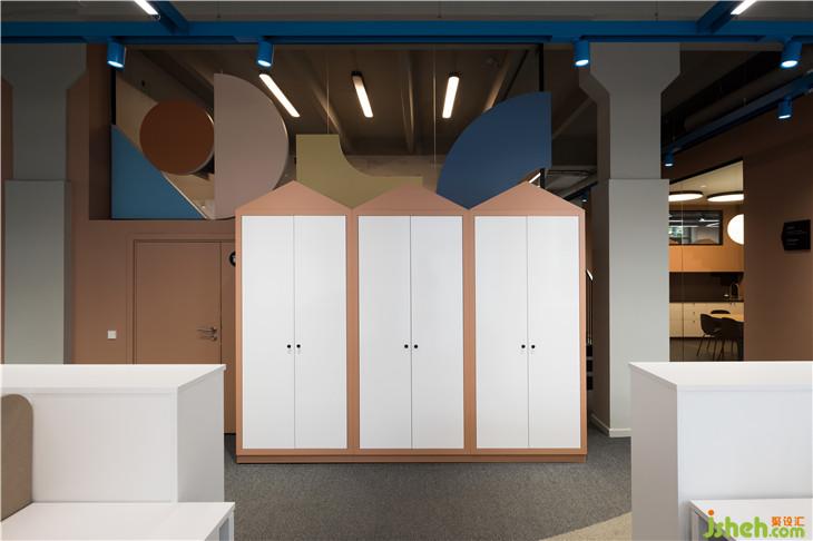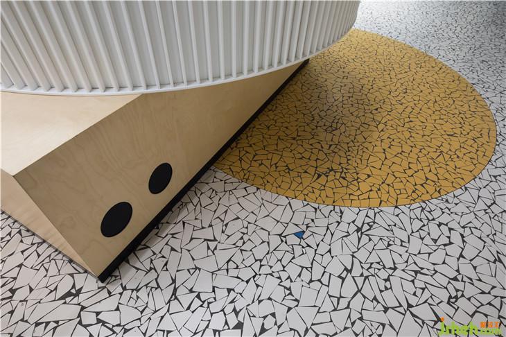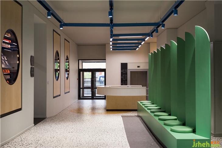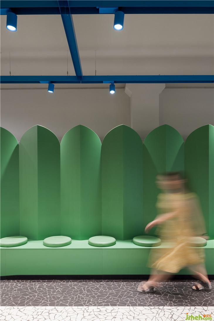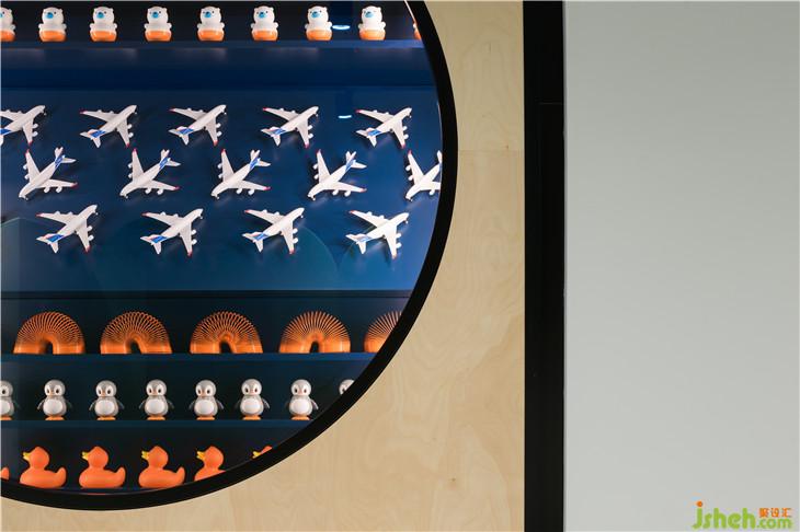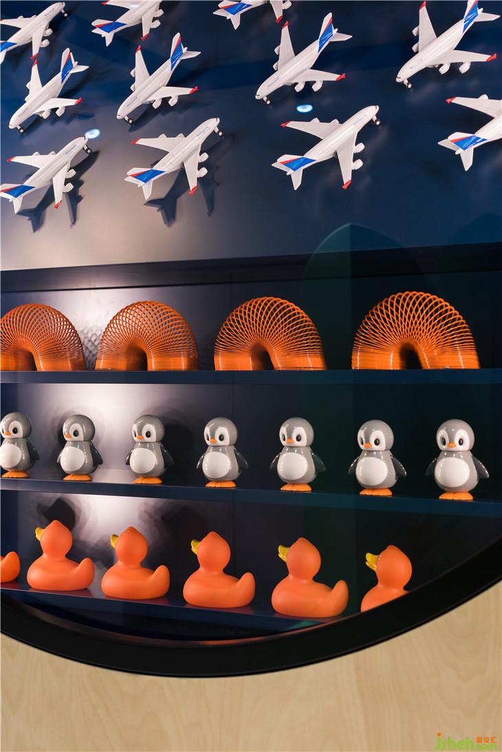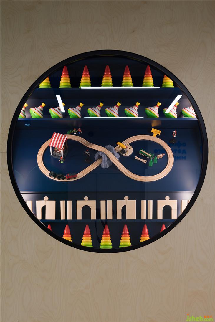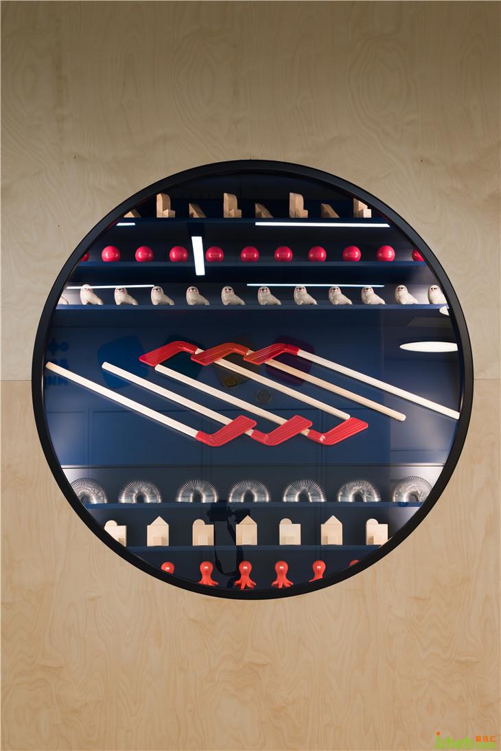 入口处墙面上的圆形展示窗口陈列着各式经典玩具,唤起人们熟悉的记忆,同时标识着棋盘游戏的开始。
