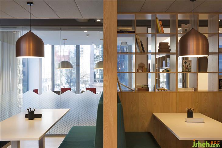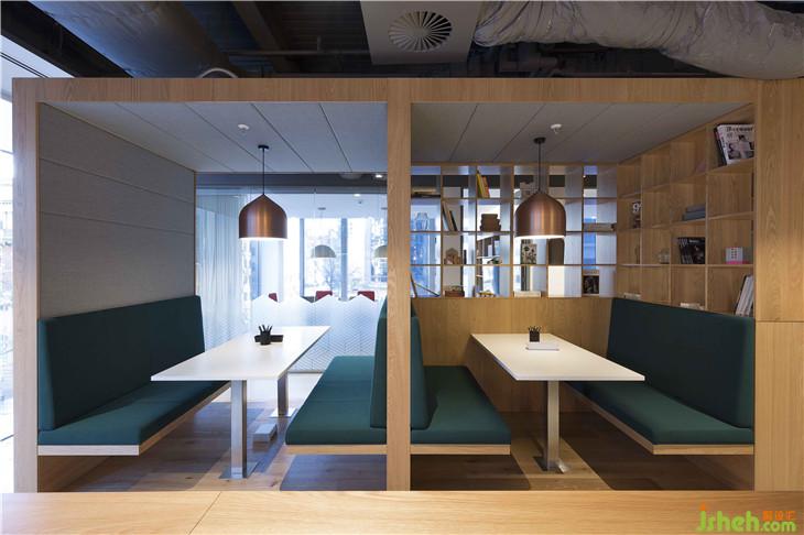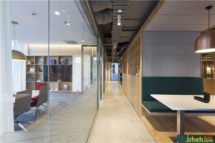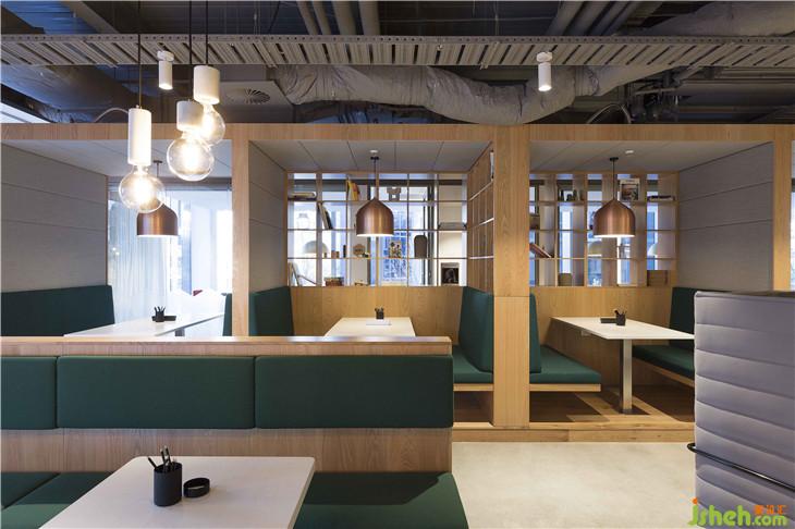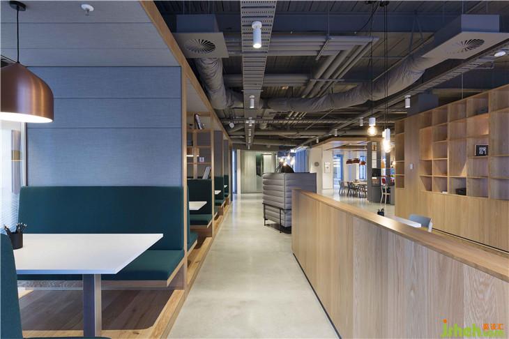 木材的冷色调使这个地方看起来清新、明亮,与灰色的管道系统非常相配。然后,红色和绿色作为办公室的主色调,这有助于创造一个令人心情愉快的环境。