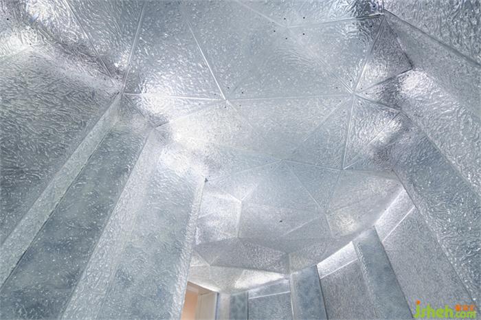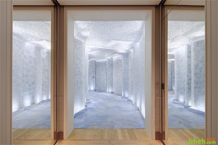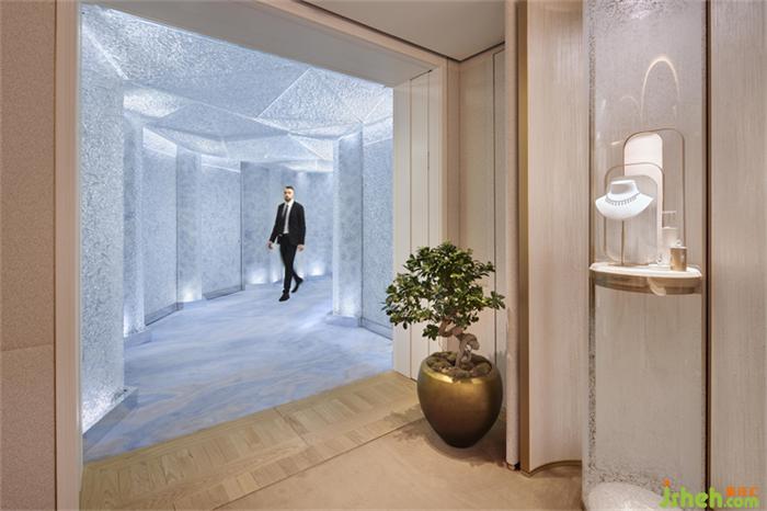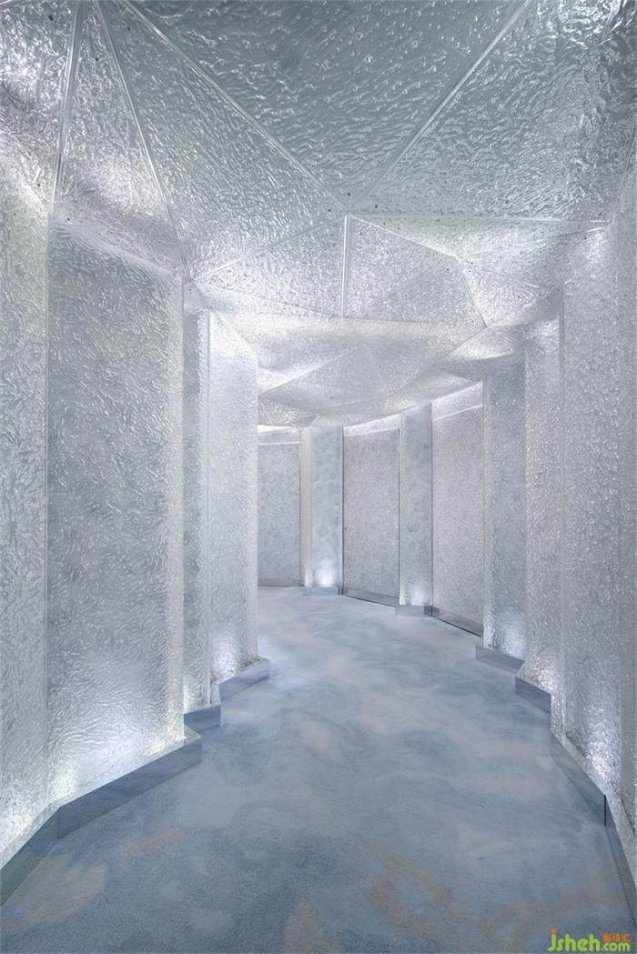 精品店的入口被水晶玻璃制作而成的冰墙所覆盖,犹如踏入一座冰封千年的童话王国,卡地亚精品店设计不规则的天花板和墙板浑然一体,像穿梭在冰川中,凌烈却变幻莫测。