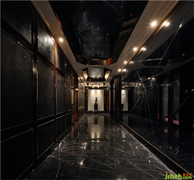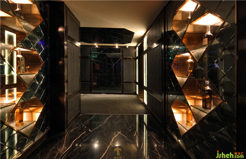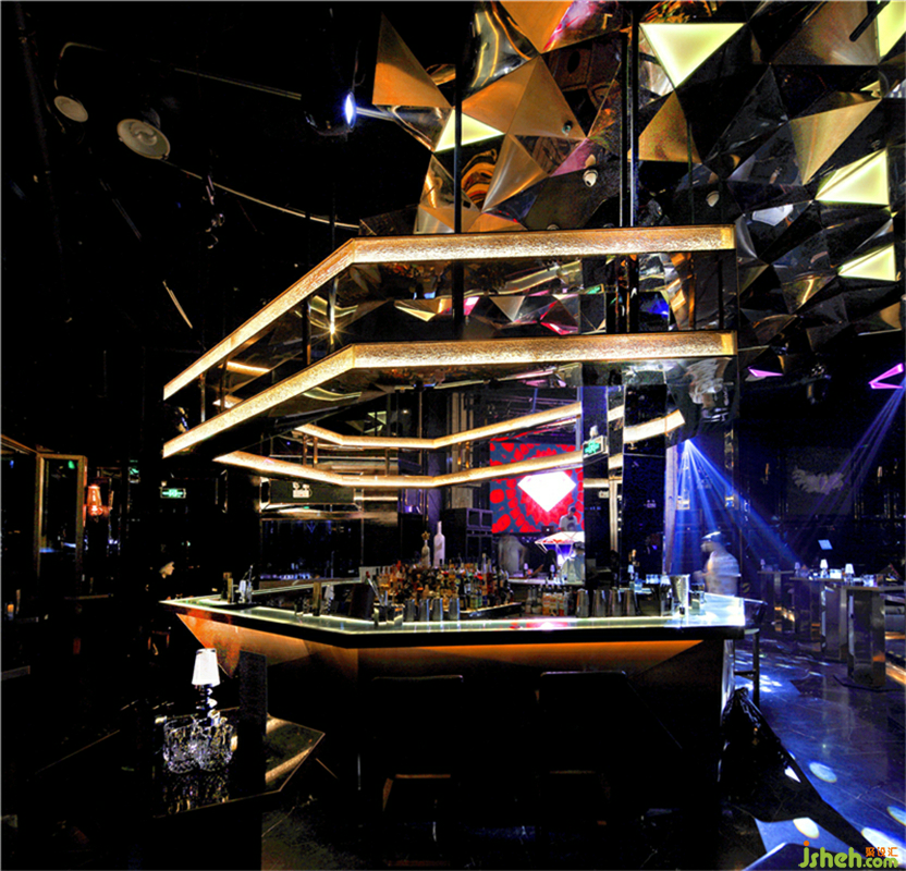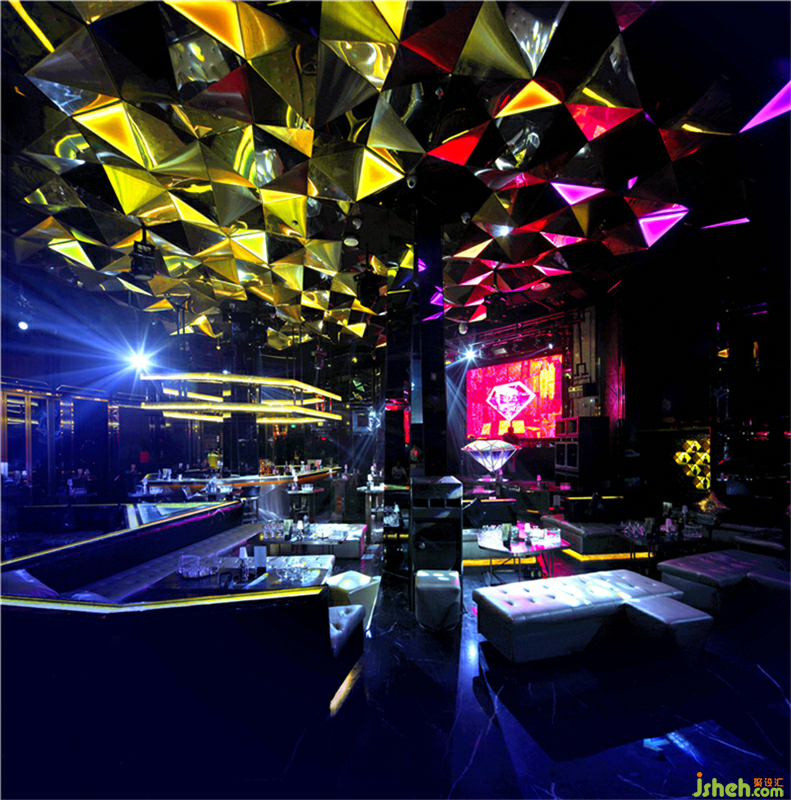 设计师把钻石的形态元素分割出来,用不同的材料,不同造型结合产生新的形态组合,或在天花,或是墙面,或是家具,又或是灯饰舞台….无一不体现钻石的时尚感。其中天花的LED造型灯饰是整个设计的亮点,LED灯光和金色不锈钢材料的层叠表现出不断变化和色彩。