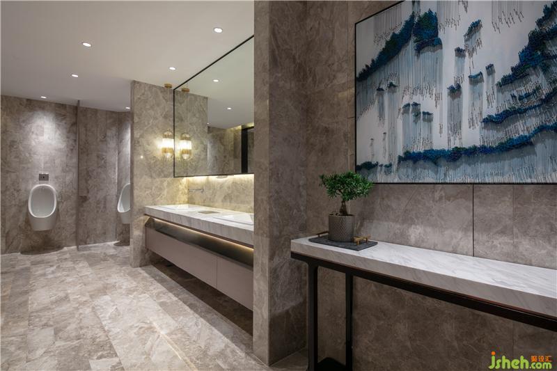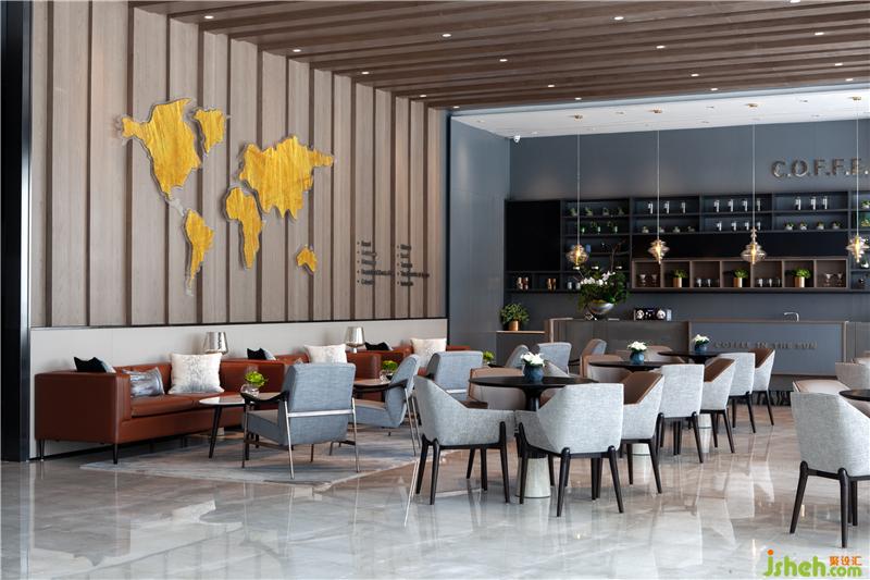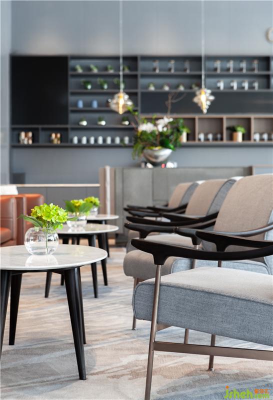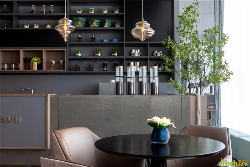 走出电梯厅,先入眼帘的,是借用作曲技巧的“重复”手法的大小不一的圆形绿栽。不一致的错落摆放,让画面呈现一种起伏的音律跳动感。壁台上间隔的果实状挂灯的设计,让空间形成明暗对比,天花上点缀的嵌入式小灯,又让空间的光线具有连续性。起伏、明暗、凹凸,处处留意的对比手法,赋予空间音乐的动感。音乐是流动的建筑,建筑是凝固的音乐。