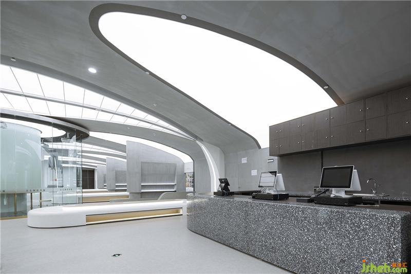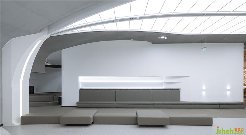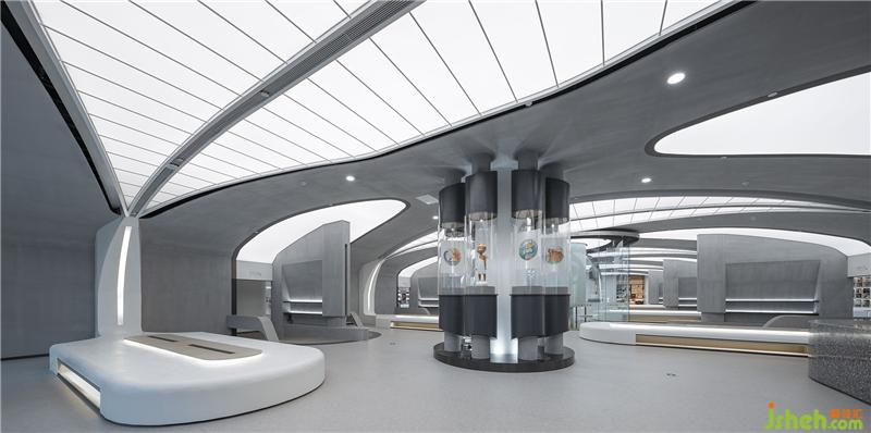 整个空间运用软膜天花照明,烘托舒适柔和的视觉感受,吊顶、墙面与地坪用水泥灰色调教出空间层次。全息3D展示玻璃管强化了未来场景元素,手作台更为儿童提供了丰富的互动内容。