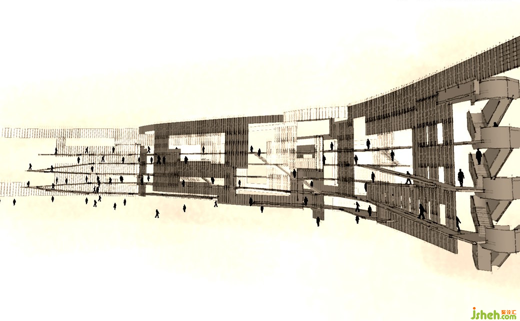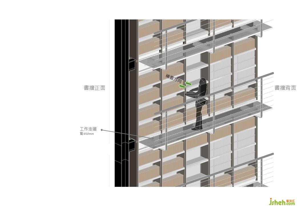 承载数十万册图书的书墙,以钢结构和透明玻璃为材质,除了视觉穿越,也让光线自由漫射在挑空区域,与空间实体交迭出各种形式的语汇。阅读者穿梭在书墙与挑空之间,成为这殿堂景象的一部分。