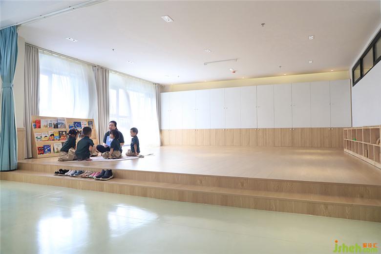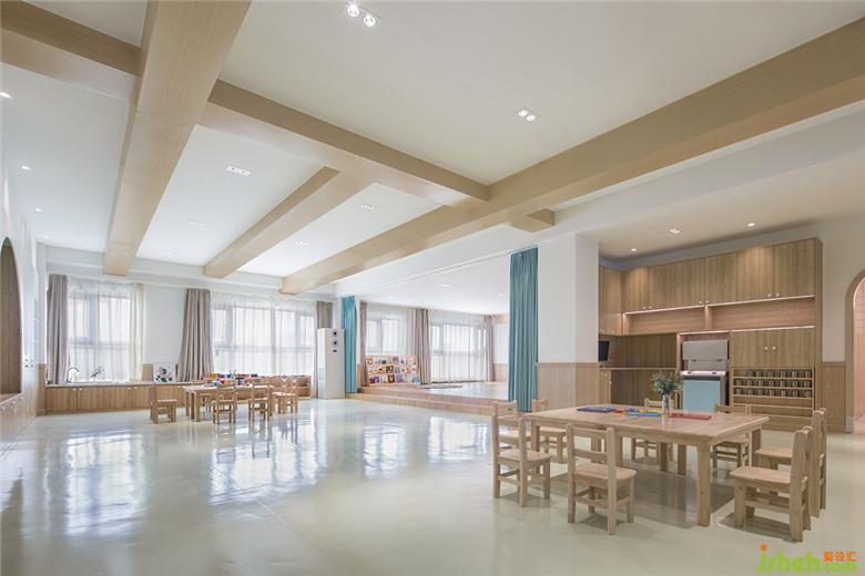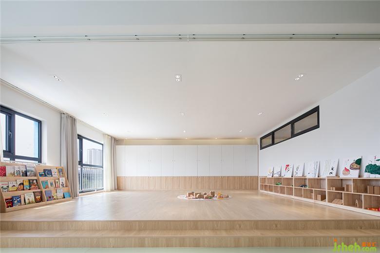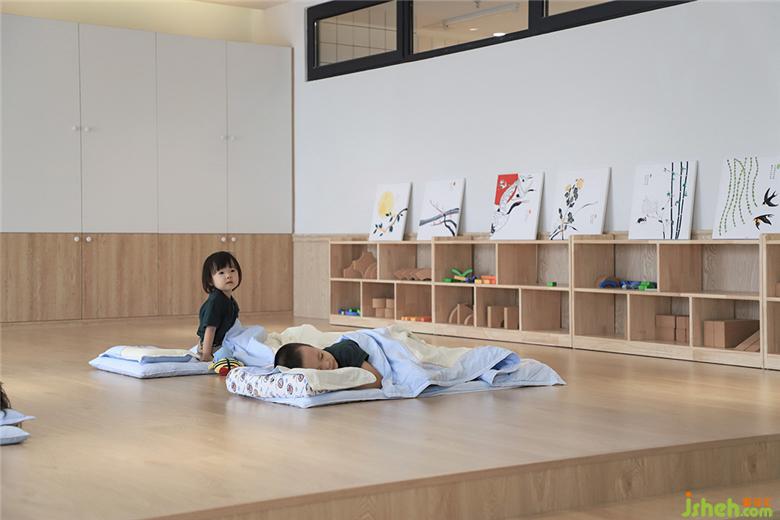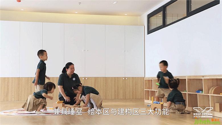 平时是建构区、课间是绘本区、午休时拉上窗帘形成榻榻米睡室,后边整面墙收纳柜和睡被柜一体,方便孩子和老师拿取,培养孩子的自主性。