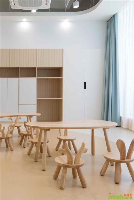 托班教室&美术教室,超大落地窗,给空间足够的采光,满足孩子们课程需求,色彩的巧妙搭配、材质的相互融合,高级又有趣。