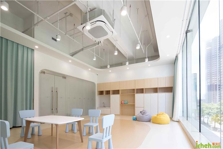 儿童空间设计光影是最好的空间装饰。原顶空间,加上明亮落地窗,空间瞬间大气了不少,让托班的孩子们得到最好的空间感受,伴随着光影微妙的变幻,构建出不一样的空间联系,让孩子产生联想和思考,解放孩子的思维。