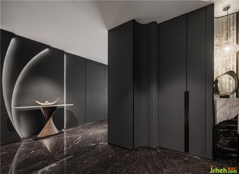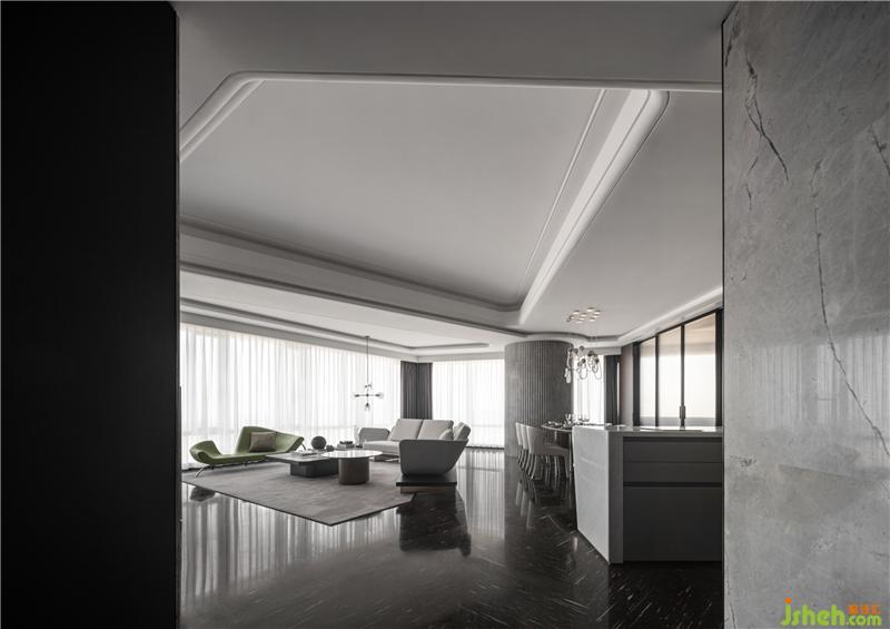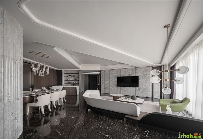 从玄关开始,如海浪般激荡的线条结合灯带舒展有致,预示了整个项目的基调。在2.4米的有限层高上,客餐厅采取尺寸、形态不规则的圈顶打造层次,白色圈顶的层叠形式彰显纵深感,与地面的镜面深色大理石相对比,营造出天与海效果,让层高得到最大化体现,使整个客餐厅将西厨、餐区、酒吧形成大气而流畅的连贯性。