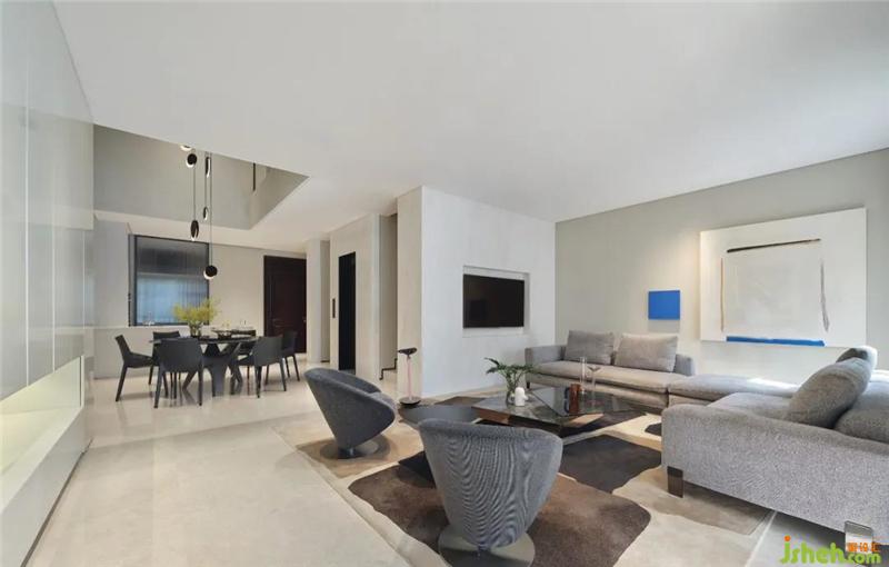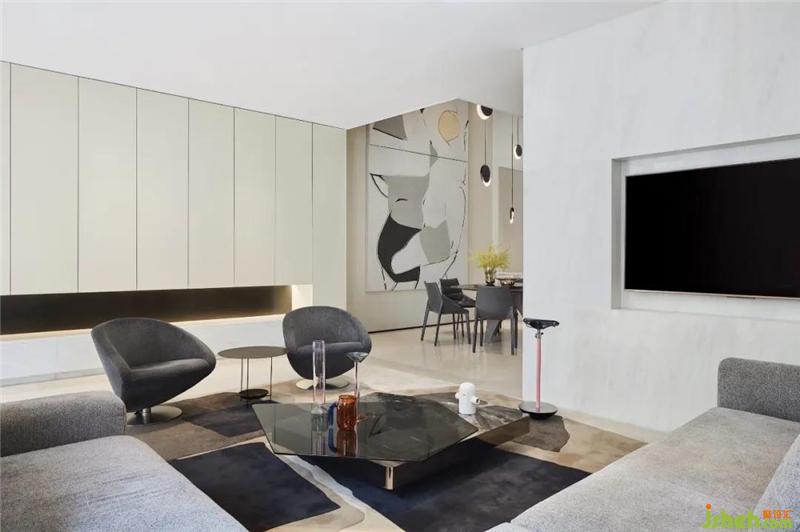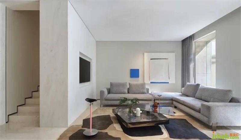 以优雅的白色与米灰色铺陈了整个空间的基底。高耸的挑空里,抽象画作为空间注入十足的艺术气息。