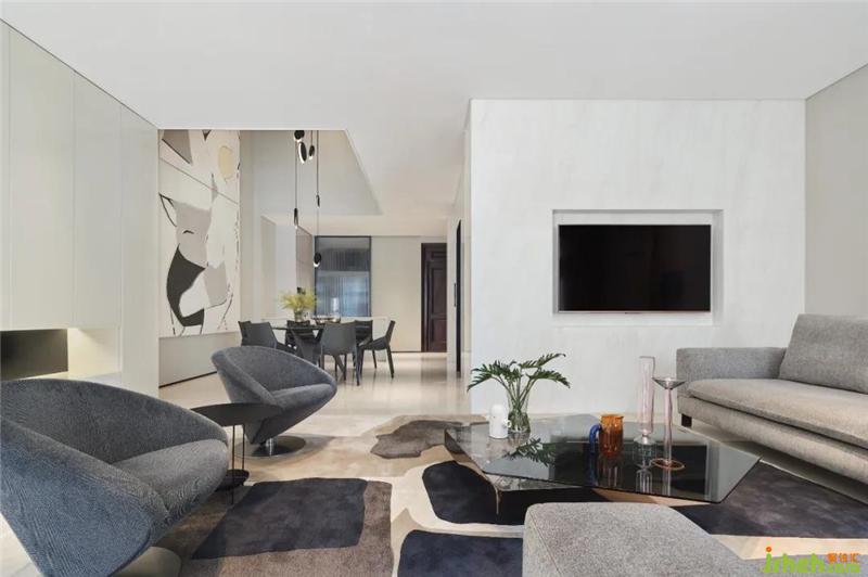 在西侧主墙体上以大面积的白色柜体取代传统电视背景墙,电视则被嵌入北侧的大理石墙。白色烤漆柜彰显极简美学,同时暗藏了大量存储空间,让空间保有至高的洁净度,西式客厅的精髓得以淋漓尽致地展现。