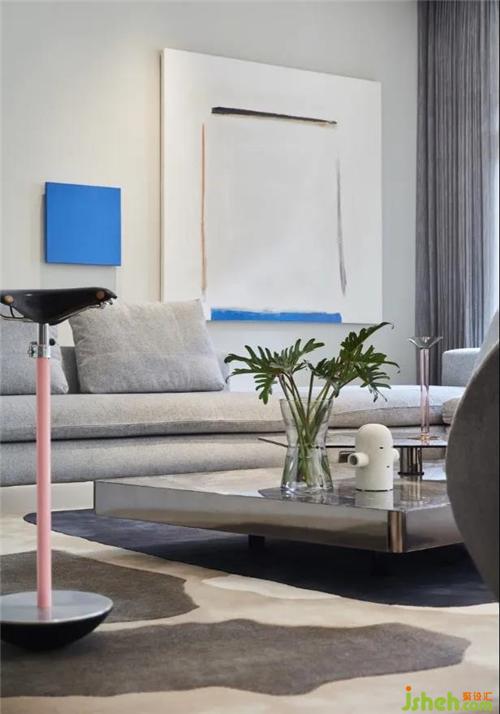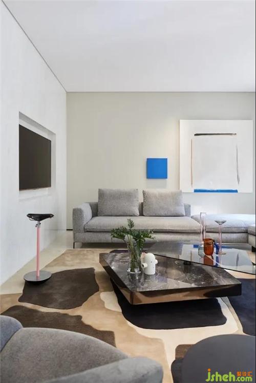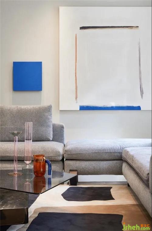 客厅墙上一大一小的极简主义画作颇有几分艺术家方塔纳的作品格调,几支线条上的色彩分别点染着茶几上的玻璃器皿。地毯上的碎石块图样也在呼应着沙发与墙壁的配色,一切和谐而不乏生动性。