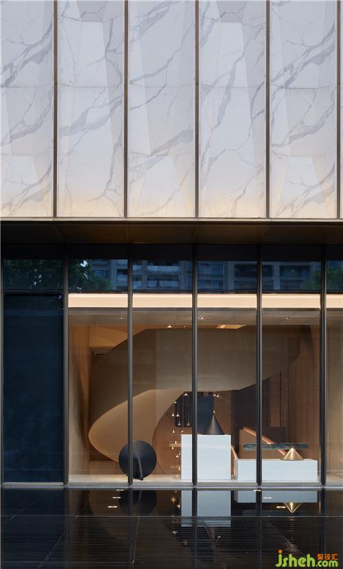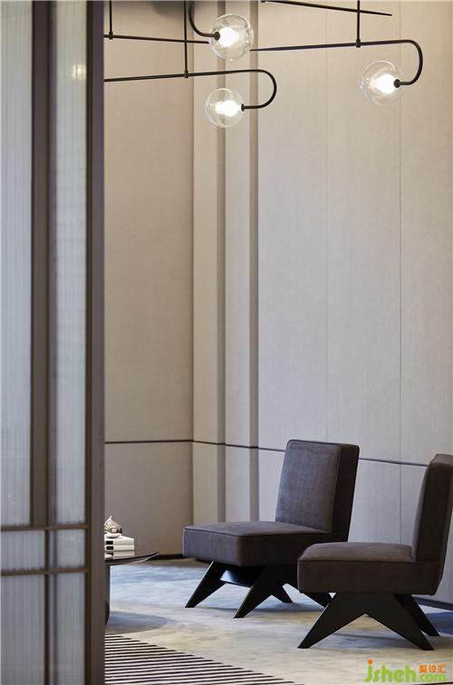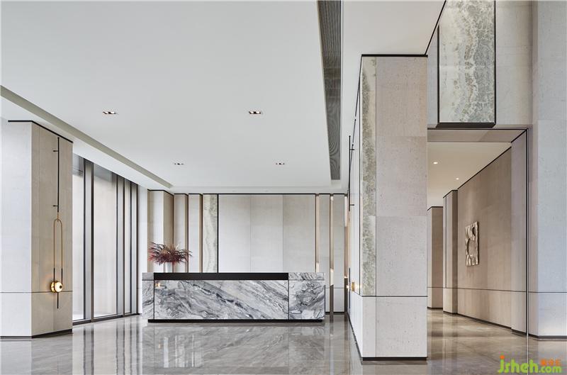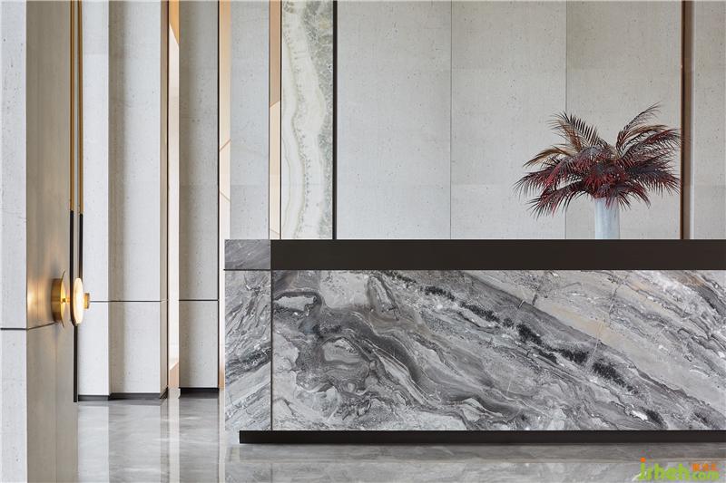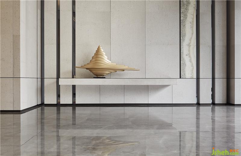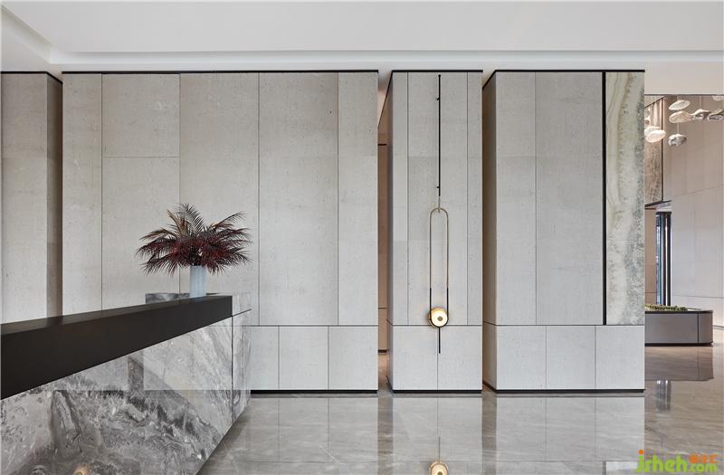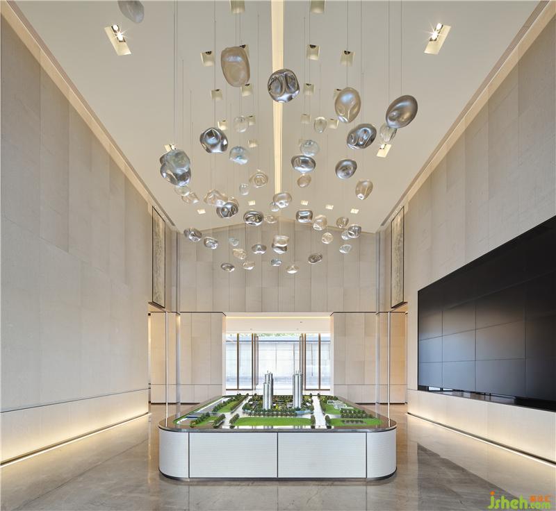 我们以抽缝的方式,将石材做出格栅的感觉,既顺应中轴线设计,又形成独特的空间矩阵,宁波售楼处设计形成空间在阅读视觉上的屏障。人在空间中移动,风景在缝隙间躲躲藏藏,如同苏州园林中的步移景异。