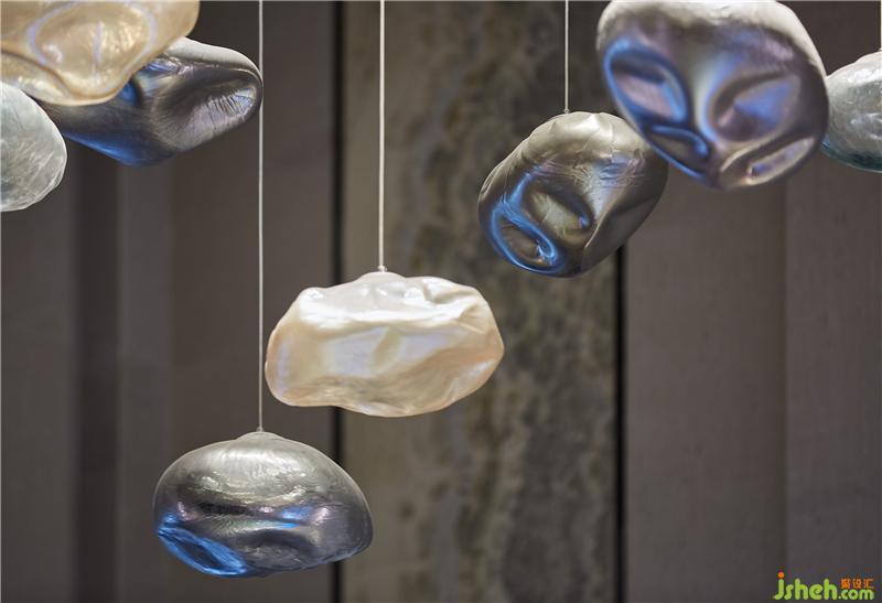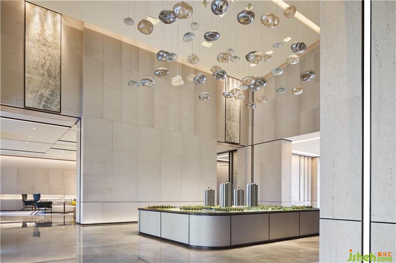 我们希望把一些中式感觉带进空间。在沙盘区上空悬挂玻璃吹制的吊饰,像漂浮在空中的石头;沙盘区的空间顶面以中式屋顶元素勾勒,所有立面以及石材的切割比例,都在延伸中式卷轴画作的意象。