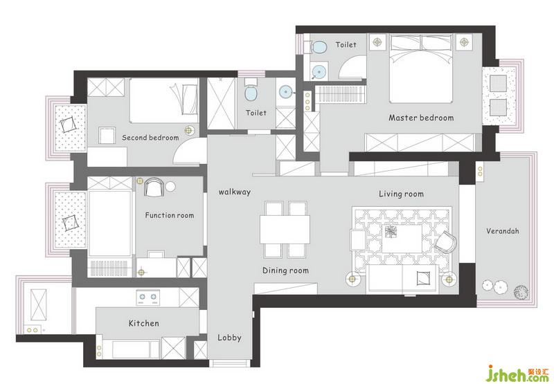 这是一套南北通透性好,比较规整的户型。室内设计师将朝北的一间房设计为书房、榻榻米和收纳兼具的多功能活动空间,释放了家里空间的合理利用率。在主卫的位置,缩小了它的空间,省去了洗浴功能,增加了主卧的收纳空间,次卫的洗浴功能完全可以满足三口之家的需求。阳台没有像传统家居那样放置洗衣机、烘干机和水池,而是作为客厅的延伸,成为单纯的休闲区,恰恰反映出这是一个会享受、爱生活的小小家。