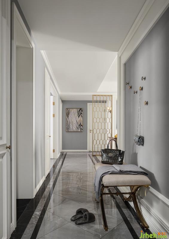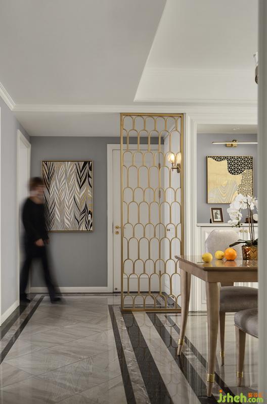 过道的尽头挂了抽象油画,我们回到家之后多了一份看点,增加了家里的艺术气息。金色隔断的设置,使得空间格局更加完整,也为家里增添了一处景致。