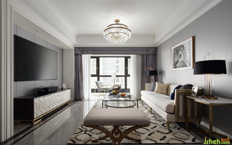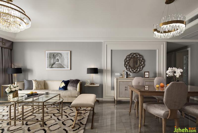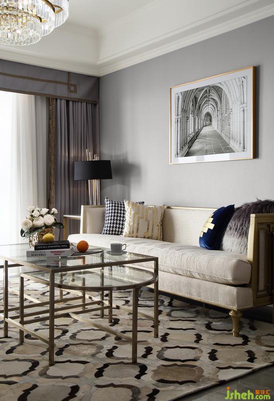 客厅光线的通透性很好,阳台作为客厅的延伸,成为了休闲区,使得活动范围更宽广,阳光充足时靠在单人沙发上也是很悠闲的。灰色的窗帘在微风下摇曳,低调静谧的气质油然而生。金色的水晶吊灯,华美大气,成为家中视觉焦点的一部分。