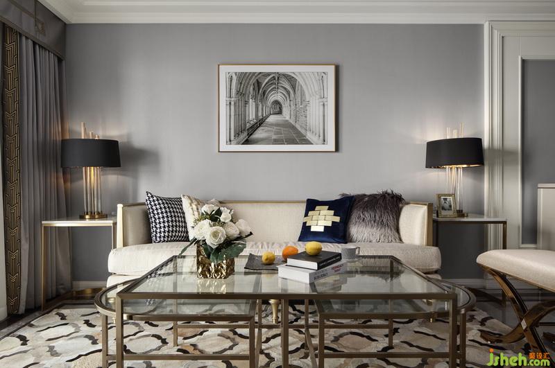 室内设计师在客厅墙面铺满了灰色的墙纸,灰色低调、沉稳,可以更加衬托出整体家居的色彩感。轻奢的复古挂画,体现了业主的艺术品位。黑色与金色结合的台灯,给家里带来优雅与精致的生活品位。