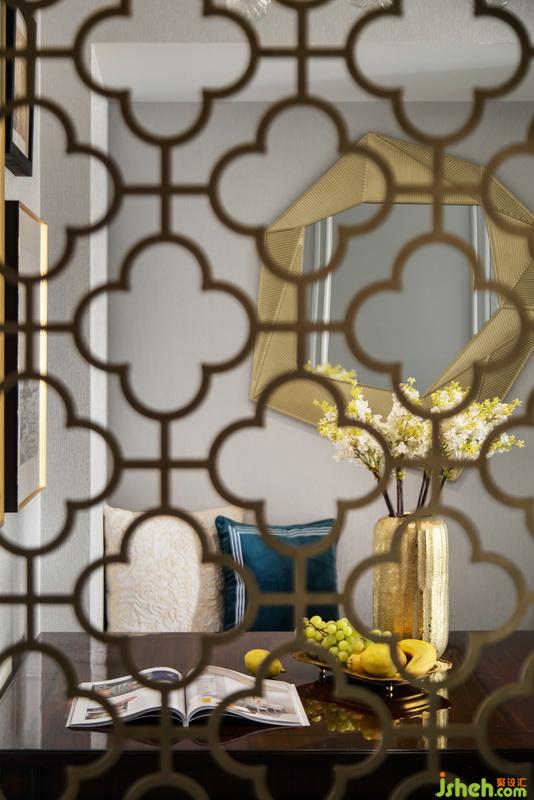 打开门进来是玄关,出现在眼前的是金色屏风隔断,图案融合东方元素,简单又不失韵味。透过屏风可以看到餐厅,增加一丝朦胧感,也给家里增添一处靓丽的风景。