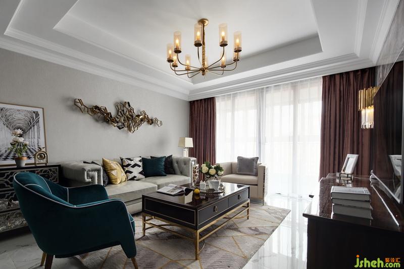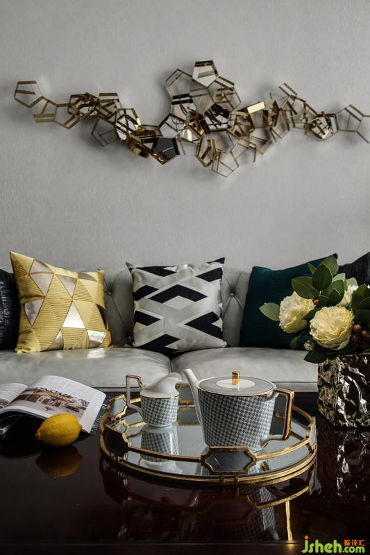 室内设计师在沙发背景上的金属壁饰大方典雅,使墙面更加充盈,在视觉上提升了空间的品质。抱枕选择了纯色与几何图案的组合,简约中增添时尚感,更加夺人眼球。