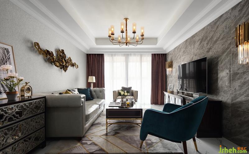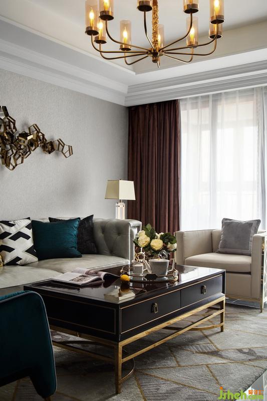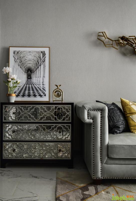装饰柜上镶嵌了梅花窗棂设计,取梅之吉祥寓意,“梅开百花之先,独天下而春”,成为家中亮眼之处。浅色的轻奢装饰画,让人感到轻松,似有一种清香味。座钟上是纯铜制作的雄鹰,低调奢华,品味时间的深度。